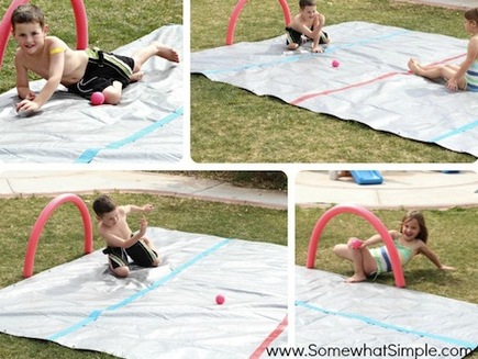 Looking for some fun and creative ways to get your kids outside this summer? This DIY water knee hockey rink from Somewhat Simple is easy to make. You'll just need a tarp, a pair of pool noodles, a wooden dowel, yard stakes and colored duct tape. Just one trip to the hardware store, and you'll have a fun kids' game that pairs well with water, for a slip-sliding good time!